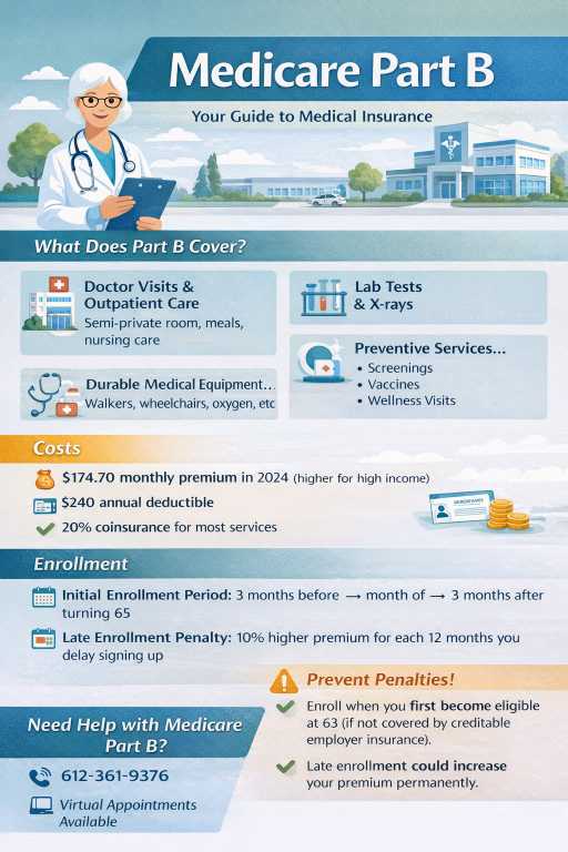 Medicare Part B covers your medical care outside the hospital. It helps pay for doctor visits, outpatient care, preventive services, and certain medical equipment. Unlike Part A, Part B usually has a monthly premium.